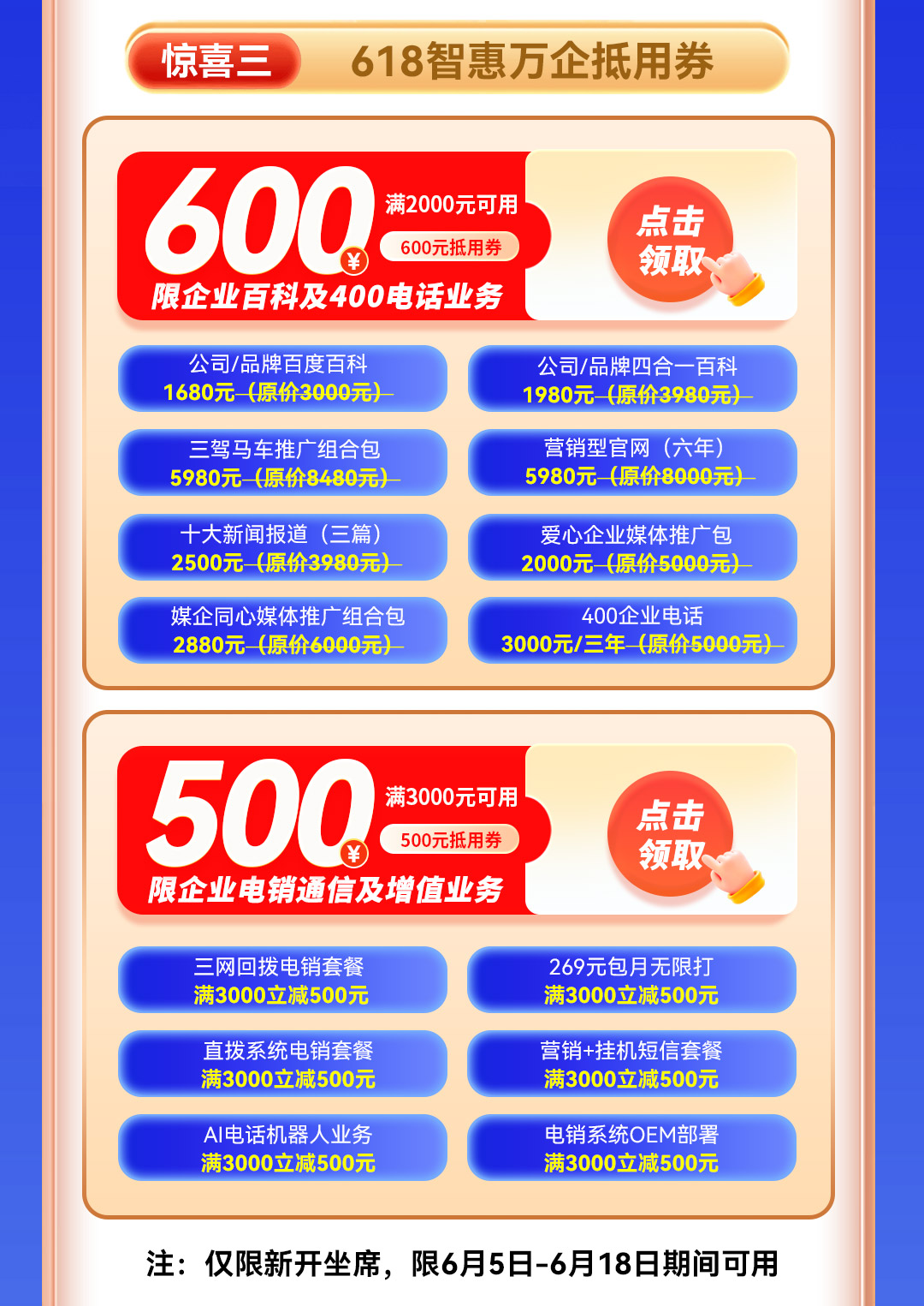 叠加福利:新开坐席可享500元抵用券,6月5日-18日限时使用!